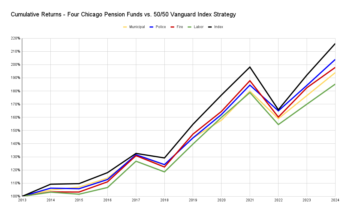 Lastly, I’d be remiss not to make one more pitch for why our pension funds should adopt passive investing. Last August I put together a little exercise to see how Chicago pension funds would have done if we simply used a passive strategy (as some public pension plans, like the State of Nevada, do) instead of allocating funds across eighty-some different investment management firms. The passive approach looked pretty good, saving us $30-40 million per year in management fees without impacting returns (a really basic 50/50 Vanguard strategy outperformed all four funds). I figured I’d update my math to account for 2024 as well.
