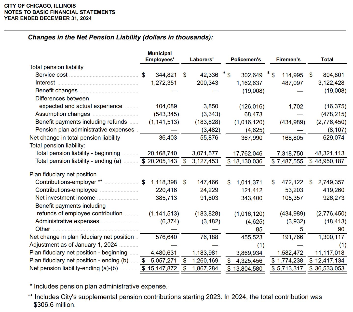If you use the city’s 2023 and 2024 ACFRs, which report net pension liability using the fair market value of the plans’ assets, our unfunded liability declined from $37.2 billion to $36.5 billion year-over-year. If you instead use the plans’ actuarial values of the plans’s assets, our unfunded liability increased from $35.5 billion to $35.8 billion year-over-year.