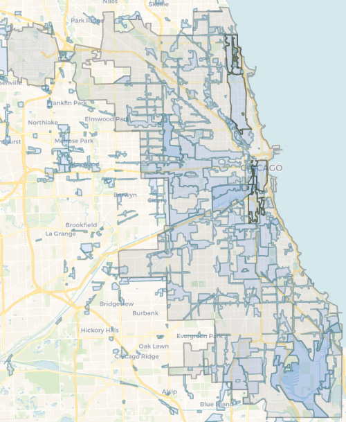 City of Chicago (grey) with TIF districts (blue). Via Chicago Cityscape.