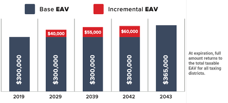When property values go up, whatever incremental tax revenue is collected on the increased value (relative to that frozen assessed base) are set aside and earmarked for the TIF District’s fund